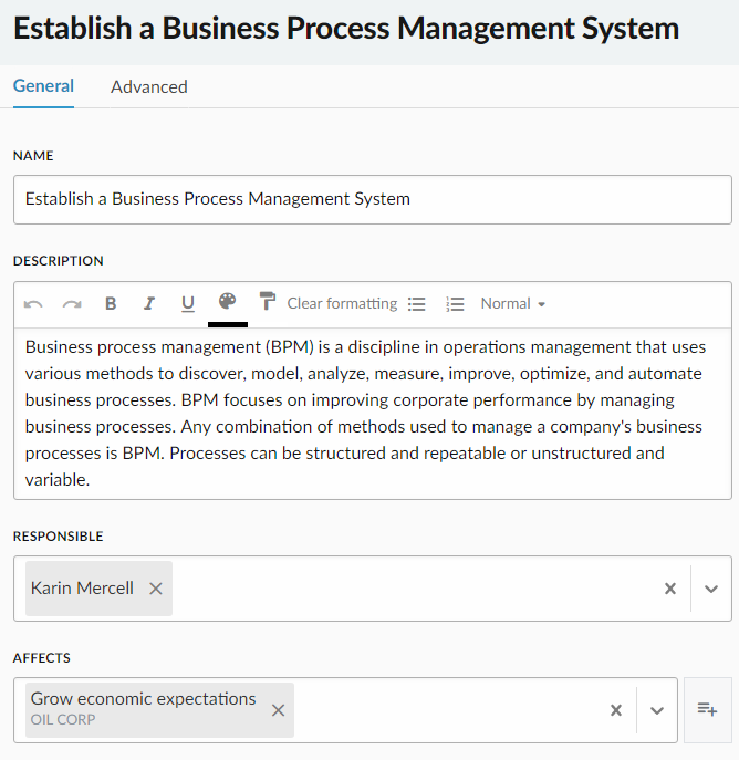 Corporater BMP table objects are a structured means to review and compare related data.